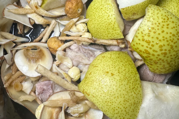功效: 雪梨係秋天當造水果,含豐富水分,具有生津潤燥、清熱化痰嘅功效。海底椰有潤肺止咳、清熱除燥嘅作用,特別適合用嚟緩解燥咳。玉竹能夠滋陰潤肺、養胃生津,對於皮膚同喉嚨乾燥有好好嘅滋潤效果。沙參亦有同樣嘅養陰清肺功效。南北杏同蜜棗則可以止咳平喘、調和藥材味道,令湯水更易入口。